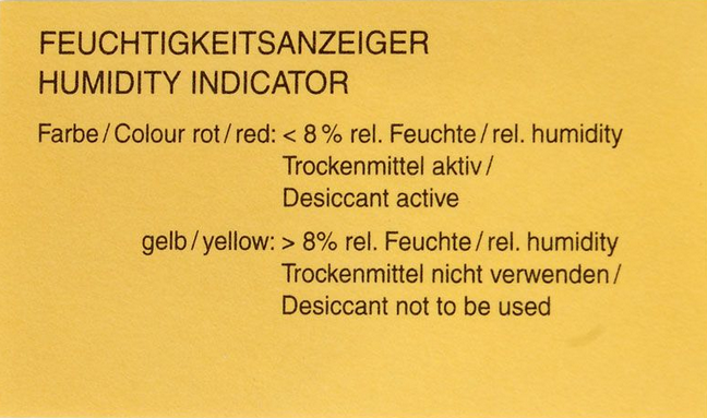 Der Farbumschlag ist reversibel, das heißt: Nach dem Austrocknen der Umgebung kehrt die Farbe wieder zu Lila zurück. Damit eignet sich die Karte ideal zur wiederholten Kontrolle der Trockenmittel-Aktivität.